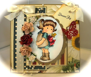 I chose Marci with Flower to work with for my card today. Isn't she just a doll??!!!! I made a circle easel card (my first one of this type, and I think I LOVE it!) to showcase Marci. I cut the Kraft base and design paper out on my cricut, and it was super easy to put together from there! I used Basic Grey Sultry design paper. I love the colors, so bright and warm for spring/summer cards. I scrunched up some white lace around the back of the top and bottom panels to give the card a super girlie feel!